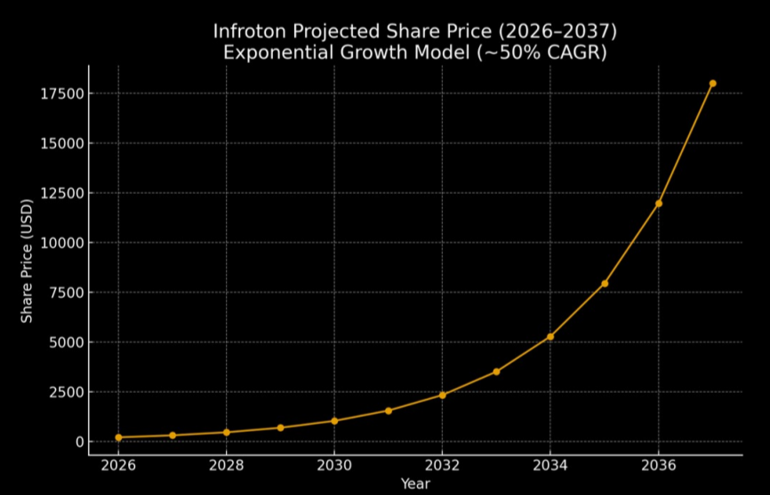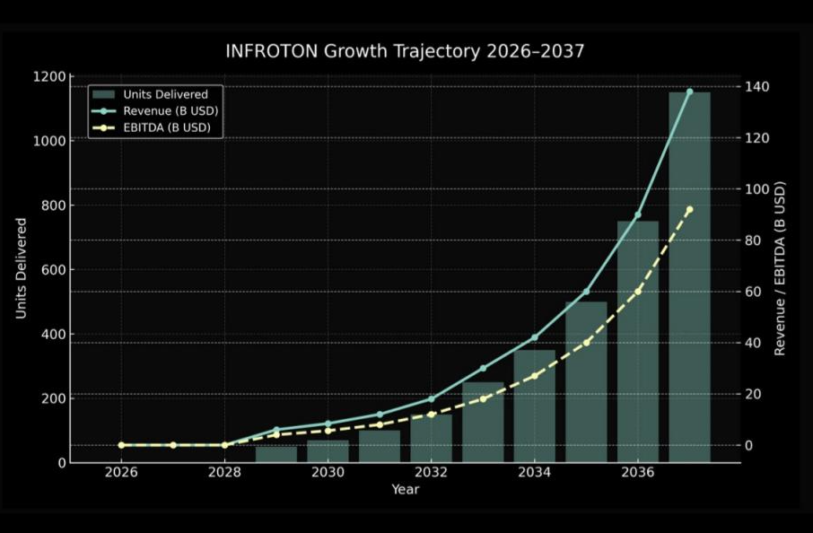 2026 valuation (based on patents and benchmarking): Infroton Inc. is estimated at $5 billion, based on expected EBITDA and comparative analysis with industry competitors such as Helion Energy and TAE Technologies. This reflects the strategic importance and commercial potential of its patented technologies in clean energy generation.